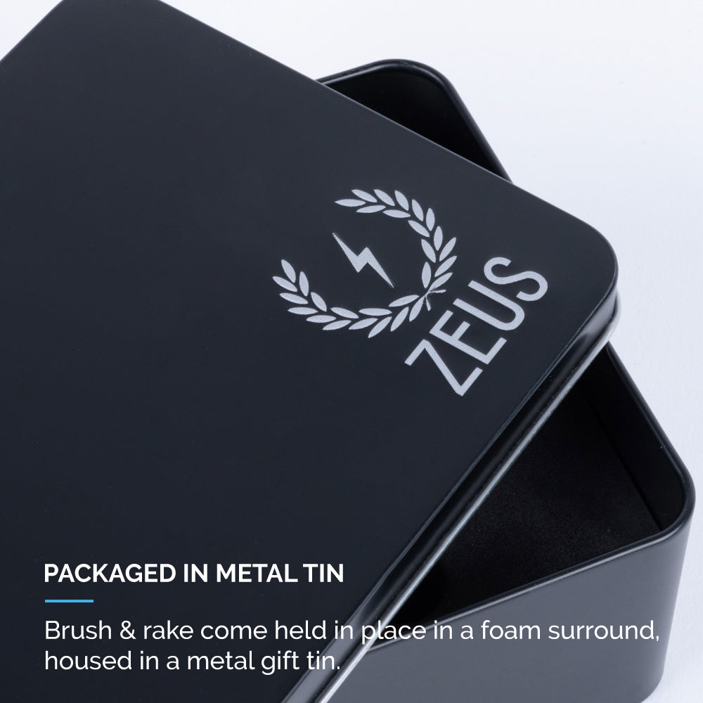 Each bundle of firm boar bristles are inset in a warp-resistant pear wood handle, complete with finger grooves for grip. The Zeus Military-Style 100% Firm Boar Bristle Oval Brush comes in reusable black tin, making it a great gift idea for the refined beardsman. Also included is a nifty brush cleaner to keep your brush in tip-top shape.